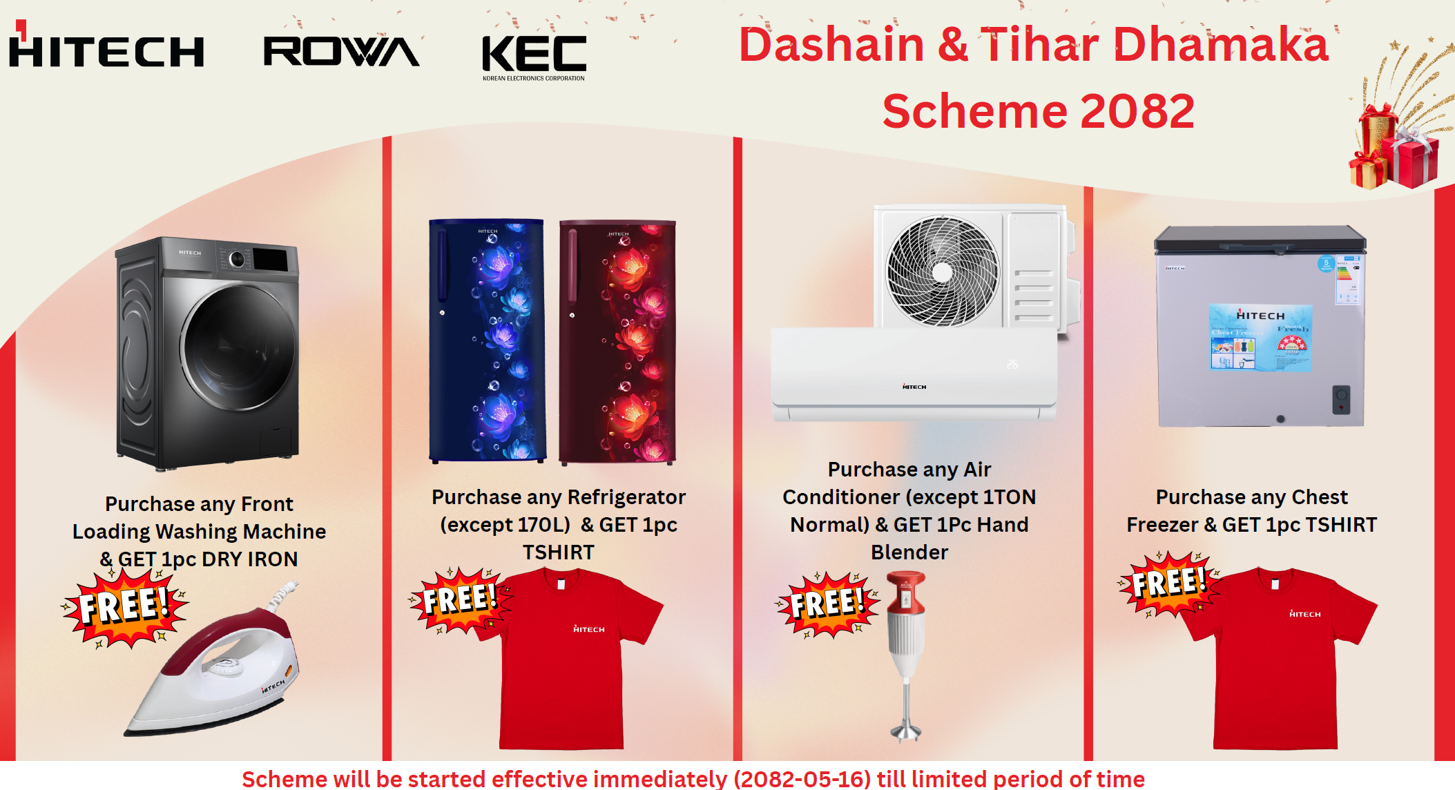 Discover a wide range of high-quality home and kitchen appliances at Hitech. From refrigerators and washing machines to air conditioners and smart TVs, we bring you the latest electronic products from trusted brands. Enjoy great prices, genuine products, and fast delivery across Nepal—all from the comfort of your home.