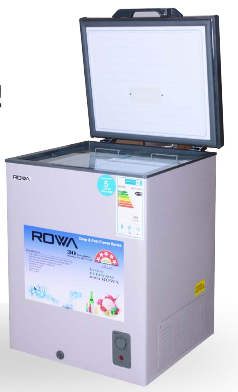 A stylish chest freezer with high efficiency, quick freezing, and noise-free operation. Features include a sliding glass door, an outside handle, and energy-saving functionality, available in multiple sizes.